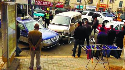 ????“人民路上一輛面包車沖向了逆行道,一下子撞了兩輛車,現(xiàn)在人民路上亂成一鍋粥了?!弊蛱煜挛?時40分左右,市民趙先生撥打早報熱線82888000報料說。記者接到線索后迅速趕到事故現(xiàn)場,看到一輛黑色三菱轎車車頭受損變形,一輛面包車的車尾被撞凹陷,面包車的車頭撞翻了一段十幾米長的護(hù)欄,并且夾著一段護(hù)欄撞上了逆行道上的一輛出租車,出租車尾部被直接頂?shù)搅艘惠v公交車上,公交車的車頭受損。除了這4輛車外,被撞壞的護(hù)欄還砸上了一輛等候信號的出租車。