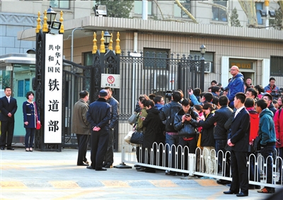 昨天下午,很多市民在鐵道部牌匾前合影留念。(記者 陶冉 攝)