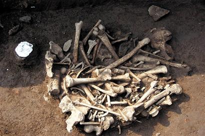 ????2009年第二次挖掘時,北阡有9具出土的人骨引人注目,它們的骨頭有明顯經(jīng)過火燒的痕跡,這些痕跡被證明出現(xiàn)在下葬前。這一“燒骨葬”的方式,引出了全新的祭祀文化說;而大量大汶口早期的多人二次葬 (撿骨葬),則集中展現(xiàn)了極具時代特色的特殊埋葬方式,在膠東半島地區(qū)還是首次發(fā)現(xiàn),這對研究大汶口文化早期喪葬風(fēng)俗和社會生活提供了重要物證。