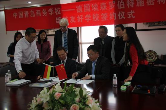 ????在簽約儀式上,商務(wù)學(xué)校校長孫信成和德國埃森羅伯特施密特職業(yè)學(xué)校校長代表Herbert Weitk?mper(維特坎貝爾)分別致辭,雙方學(xué)校都表示對(duì)今后的合作與交流充滿信心。教育局職成處領(lǐng)導(dǎo)向中德兩所學(xué)校正式建立友好合作關(guān)系表示了熱烈的祝賀,對(duì)雙方學(xué)校前期工作予以充分肯定,真誠希望青島商務(wù)學(xué)校和埃森市羅伯特施密特職業(yè)學(xué)校的教育交流日益密切,合作成果層出不窮。