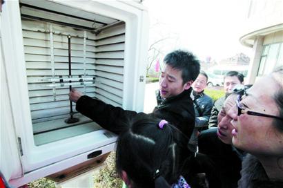 昨天上午不到9時,市氣象臺門口已經(jīng)聚集了許多市民,大部分是家長帶孩子來了解氣象知識。市氣象臺院內(nèi)停放了氣象應(yīng)急指揮車和移動風(fēng)廓線雷達(dá)車供市民參觀?!白罱鞖饩秃隼浜鰺?,變化無常,前幾天最高氣溫躥到近24℃,這幾天又冷下來了,我們來了解氣象知識,也想順便問問關(guān)心的氣溫還有霾天的問題?!睅е⒆右黄饋淼年愊壬f,他們每天在家通過電視、報紙等渠道獲取氣象預(yù)報,但并不知道氣象預(yù)報是怎么來的,在孩子的眼里還以為氣象預(yù)報員都是 “能掐會算”的。
