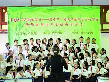????“弟子規(guī),圣人訓(xùn),首孝弟,次謹(jǐn)信,泛愛(ài)眾……”昨日下午,德縣路小學(xué)校園里傳來(lái)陣陣瑯瑯誦讀聲,市南區(qū)“我們的節(jié)日——端午節(jié)”經(jīng)典詩(shī)文誦讀活動(dòng)在這里熱鬧舉行。學(xué)生用他們稚嫩的聲音吟誦著有關(guān)中國(guó)傳統(tǒng)節(jié)日端午的詩(shī)篇,而且還以情景劇等活潑的形式誦讀傳統(tǒng)文化經(jīng)典 《弟子規(guī)》《三字經(jīng)》等,最后孩子們還現(xiàn)場(chǎng)書(shū)法展示,讓大家感受到了傳統(tǒng)文化在校園里的浸潤(rùn)。 (記者 章芳 攝) |