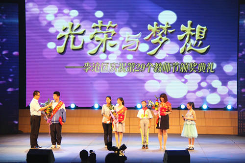 ????9月10日上午,李滄區(qū)慶祝第29個教師節(jié)頒獎典禮在李滄劇院隆重舉行,區(qū)領(lǐng)導(dǎo)戴玉環(huán)、鄭海濤、張衛(wèi)星出席典禮,區(qū)直各部門、各街道主要負(fù)責(zé)人,全區(qū)各中小學(xué)、幼兒園主要負(fù)責(zé)人,部分區(qū)人大代表和政協(xié)委員,教師代表、家長代表等千余人參加了活動。