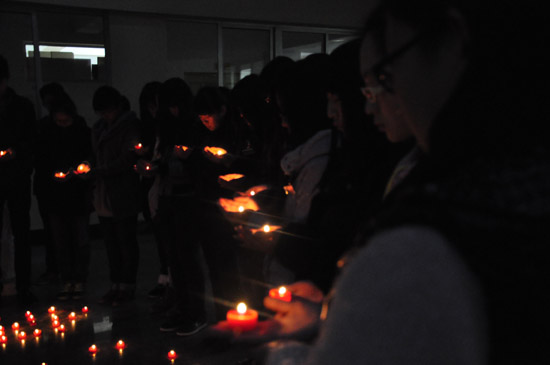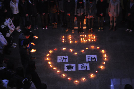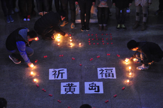 ????11月22日,青島經(jīng)濟(jì)技術(shù)開發(fā)區(qū)(黃島區(qū))中石化東黃輸油管道發(fā)生泄漏爆炸事故,截至25日7時,事故造成55人死亡、9人失蹤,依然有136人受傷住院。為悼念事故遇難者、祝愿傷者早日康復(fù),青島濱海學(xué)院校學(xué)聯(lián)組織舉行了此次祈?;顒??;顒又?,同學(xué)們在卡紙上寫下對于逝者的悼念話語和對傷員及救災(zāi)人員的祝愿,并手捧燭火,共同為在事故中遇難者默哀。許多聞訊趕來的同學(xué)也紛紛加入到活動當(dāng)中,為失蹤和受傷的市民祈福。