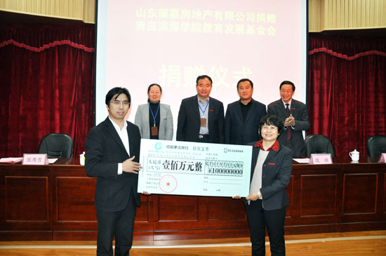 ????2013年12月3日下午,山東振嘉房地產(chǎn)有限公司向青島濱海學(xué)院教育發(fā)展基金會(huì)捐贈(zèng)儀式在青島濱海學(xué)院學(xué)術(shù)報(bào)告廳舉行,該公司向?qū)W?;饡?huì)捐贈(zèng)人民幣100萬元,重點(diǎn)用于獎(jiǎng)勵(lì)和資助優(yōu)秀學(xué)生和貧困生學(xué)習(xí),這也是基金會(huì)建立以來收到的最大的單筆捐助。