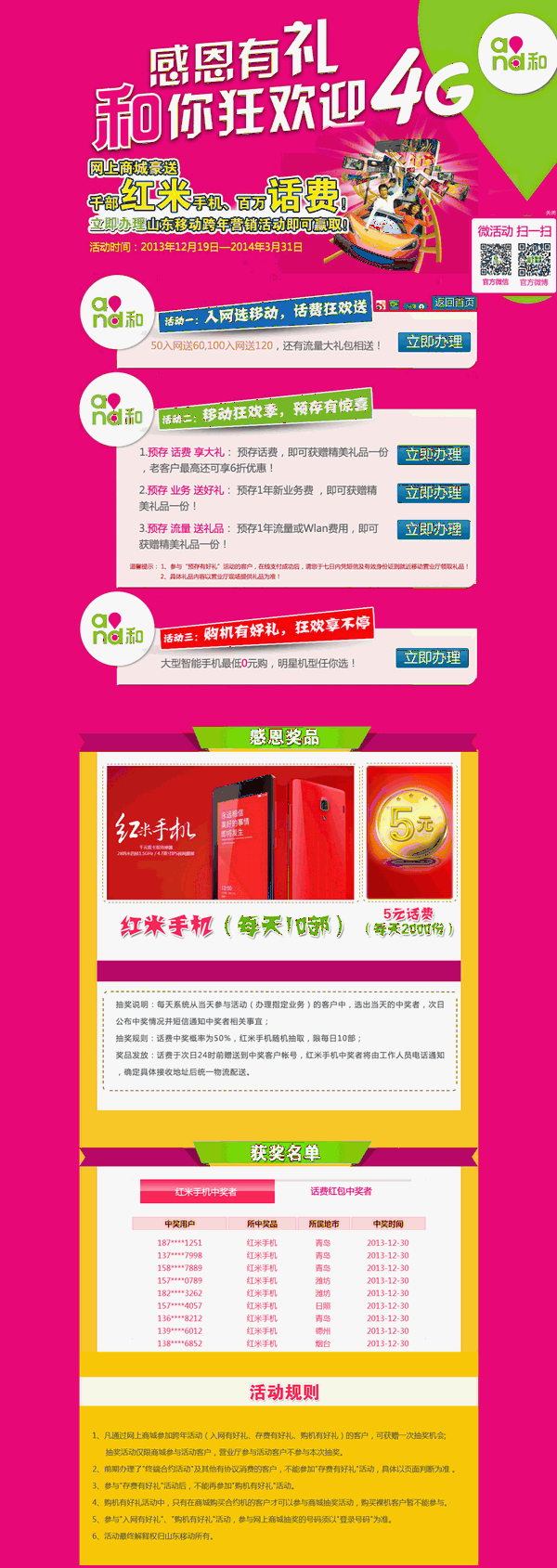 ????通過網(wǎng)上商城參加山東移動跨年活動(入網(wǎng)有好禮、預存有好禮、購機有好禮)的客戶,可獲贈一次抽獎機會。獎品為:紅米手機(每天10部)、5元話費(每天2000份)。