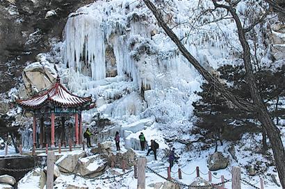 ????據(jù)介紹,這樣的冰瀑在平度茶山多達四處。巨大的冰瀑凝固在陡峭的巖石上,處處展示著大自然的鬼斧神工,再加上周圍的白雪和綠松,宛如一幅氣勢磅礴的冬日畫卷,令人嘆為觀止。