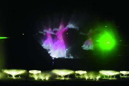 ????緊接著在下一個水舞秀節(jié)目中,舒緩的音樂引來一名身著彩衣的女子,美妙的身姿伴隨著寬大的衣服、長長的水袖舞動著,“人怎么會在空中飄浮?不可能有舞臺呀,就算放電影,也得有個屏幕撐著吧!”有幸觀賞夜場水舞秀的工作人員、游客簡直驚呆了。世園會工作人員則解開了謎底,原來天水之中有許多噴頭,其中一部分噴出精細的水霧,彌漫在半空中,遠處的投影儀將視頻投放到水幕上,水幕成了視頻播放的屏幕。