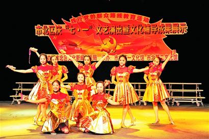 ????6月26日,市北區(qū)“慶七一”文化演出暨文化輔導(dǎo)成果展示活動在市北區(qū)第一文化館成功舉辦,展示了在黨的群眾路線教育實(shí)踐活動中文化輔導(dǎo)下基層取得的成果。在兩個文化館免費(fèi)開放活動中脫穎而出的優(yōu)秀團(tuán)隊(duì)和下社區(qū)輔導(dǎo)培訓(xùn)中涌現(xiàn)出來的優(yōu)秀隊(duì)伍共同參與了演出,大部分為群眾性原創(chuàng)節(jié)目。圖為原創(chuàng)音樂快板節(jié)目《門》。