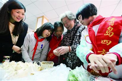 ????每天下午3時,小區(qū)的空巢老人孫大爺總會坐著小馬扎在小學門口,看著別的爺爺奶奶拎著小水壺,挎著小書包,牽著孫子孫女的手,滿臉笑容地往家里走,老人的眼睛里寫滿了寂寞。昨天由四方實驗小學6名80后老師組成的早報敬老精英志愿者團隊,帶著42名小學生走進社區(qū),跟那里的空巢老人們一起包餛飩吃餛飩,將孩子們的一份孝心傳遞到老人心中?!拔覀兿MM織孩子們跟空巢老人定期互動,慰藉老人對遠在外地孫子孫女的思念之情?!敝驹刚叻侥壤蠋煼Q。