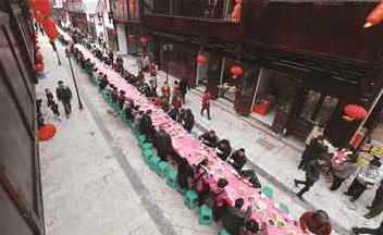 ????2月7日,貴州安順好吃街開業(yè),為答謝廣大食客,舉辦了免費(fèi)“千人長桌宴”活動(dòng)。據(jù)介紹,免費(fèi)長桌宴以安順特色“殺豬飯”為主,加上各個(gè)商家提供的當(dāng)?shù)貍鹘y(tǒng)特色小吃?;顒?dòng)于2月9日結(jié)束。(盧維 攝)