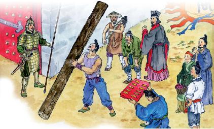 ????春秋戰(zhàn)國(guó)時(shí),秦國(guó)的商鞅在秦孝公的支持下主持變法。當(dāng)時(shí)處于戰(zhàn)爭(zhēng)頻繁、人心惶惶之際,為了樹(shù)立威信,推進(jìn)改革,商鞅下令在都城南門外立一根三丈長(zhǎng)的木頭,并當(dāng)眾許下諾言:誰(shuí)能把這根木頭搬到北門,賞金十兩。圍觀的人不相信如此輕而易舉的事能得到如此高的賞賜,結(jié)果沒(méi)人肯出手一試。于是,商鞅將賞金提高到50金。重賞之下必有勇夫,終于有人站起將木頭扛到了北門。商鞅立即賞了他五十金。商鞅這一舉動(dòng),在百姓心中樹(shù)立起了威信,而商鞅接下來(lái)的變法就很快在秦國(guó)推廣開(kāi)了。新法使秦國(guó)漸漸強(qiáng)盛,最終統(tǒng)一了中國(guó)。
