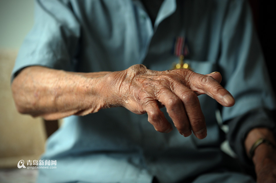 ????楊友平老人右手的手腕上有一個(gè)大包,顏色發(fā)紫,高高凸起,這是曾被彈片擊中的部位。當(dāng)時(shí),一塊碩大的彈片擊中他的手腕,擊碎了幾根骨頭,為了避免感染,軍醫(yī)勸他截肢。倔強(qiáng)的老人死活不同意,他說:“留著這只手我還能和日本兵拼刺刀,割了手我就不能上戰(zhàn)場了?!弊詈?,楊老的傷口沒有感染,手保住了,但殘留的骨頭渣子無法取出,留在了身體里,形成了大包。(青島新聞網(wǎng)記者 孫志文 徐愷 攝影報(bào)道)