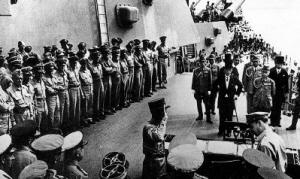 1945年9月2日上午,日本投降的簽字儀式于停泊在東京灣的美國(guó)戰(zhàn)列艦“密蘇里”號(hào)上舉行。