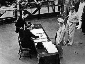 9月2日上午,日本投降的簽字儀式于停泊在東京灣的美國(guó)戰(zhàn)列艦“密蘇里”號(hào)上舉行。當(dāng)日9時(shí)4分,13年前在上海被炸斷腿的日本新任外相重光葵和參謀總長(zhǎng)梅津美治郎顫顫巍巍地登上這艘曾在硫磺島、沖繩島登陸戰(zhàn)中威震一時(shí)的功勛戰(zhàn)艦,而他們所能做的,只是代表日本政府在投降書(shū)上簽字。9時(shí)8分,麥克阿瑟以盟國(guó)最高司令官的身份簽字,接受日本投降,其余9個(gè)盟國(guó)代表包括中國(guó)代表徐永昌將軍也都分別代表本國(guó)依次簽字,整個(gè)過(guò)程不到十分鐘。簽字儀式結(jié)束后,上千架美軍飛機(jī)越過(guò)“密蘇里”號(hào)軍艦、掠過(guò)東京灣上空,慶祝這一偉大歷史時(shí)刻。至此,第二次世界大戰(zhàn)以法西斯軸心國(guó)的失敗和反法西斯同盟國(guó)的勝利而宣告結(jié)束。