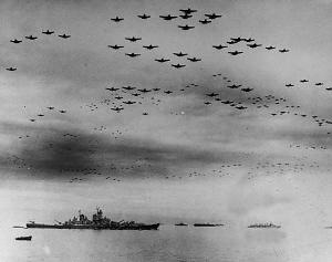 美軍近千架飛機(jī)編隊(duì)飛過(guò)密蘇里號(hào)上空,見(jiàn)證這一偉大歷史時(shí)刻,宣告日本法西斯的徹底失敗。