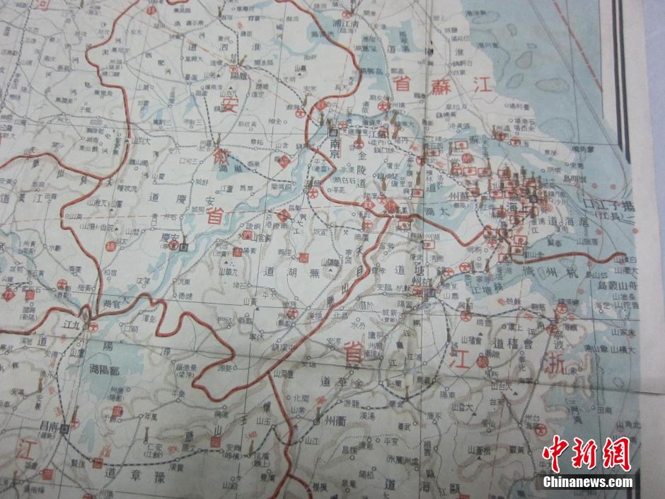 ????近日,湖南郴州北湖區(qū)發(fā)現(xiàn)一張由日本“日の出編輯局編篡”的《支那最新大地圖》。這張日本侵華作戰(zhàn)地圖發(fā)行于1938年1月1日,左側(cè)印有“特別注明,不許復(fù)制”字樣。地圖上詳細(xì)標(biāo)注了當(dāng)時(shí)中國(guó)中東部各省政府所在地、機(jī)場(chǎng)、鐵路、河道,以及石油、煤炭、鐵、羊毛等盛產(chǎn)地,還有國(guó)民政府所設(shè)無(wú)線電臺(tái)地點(diǎn)。地圖的背面還印制了《皇軍新兵器寫(xiě)真一覽》,左上方注明“日本陸軍少將大場(chǎng)彌平編篡”。中新社發(fā)黃信粼 攝