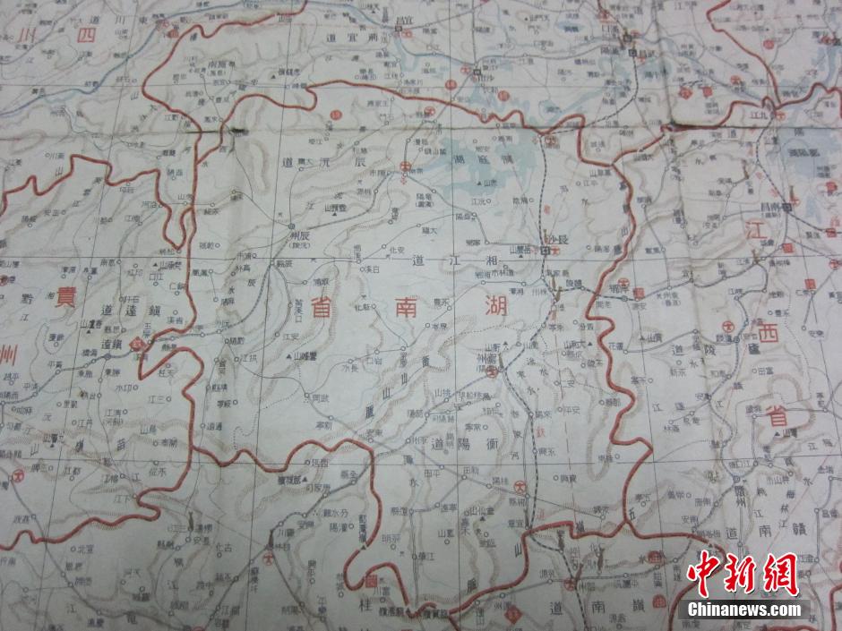 ????近日,湖南郴州北湖區(qū)發(fā)現(xiàn)一張由日本“日の出編輯局編篡”的《支那最新大地圖》。這張日本侵華作戰(zhàn)地圖發(fā)行于1938年1月1日,左側(cè)印有“特別注明,不許復(fù)制”字樣。地圖上詳細(xì)標(biāo)注了當(dāng)時中國中東部各省政府所在地、機場、鐵路、河道,以及石油、煤炭、鐵、羊毛等盛產(chǎn)地,還有國民政府所設(shè)無線電臺地點。地圖的背面還印制了《皇軍新兵器寫真一覽》,左上方注明“日本陸軍少將大場彌平編篡”。中新社發(fā)黃信粼 攝