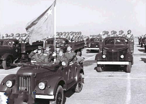 2、受閱部隊(duì)乘坐第一批出廠的國產(chǎn)解放牌汽車。