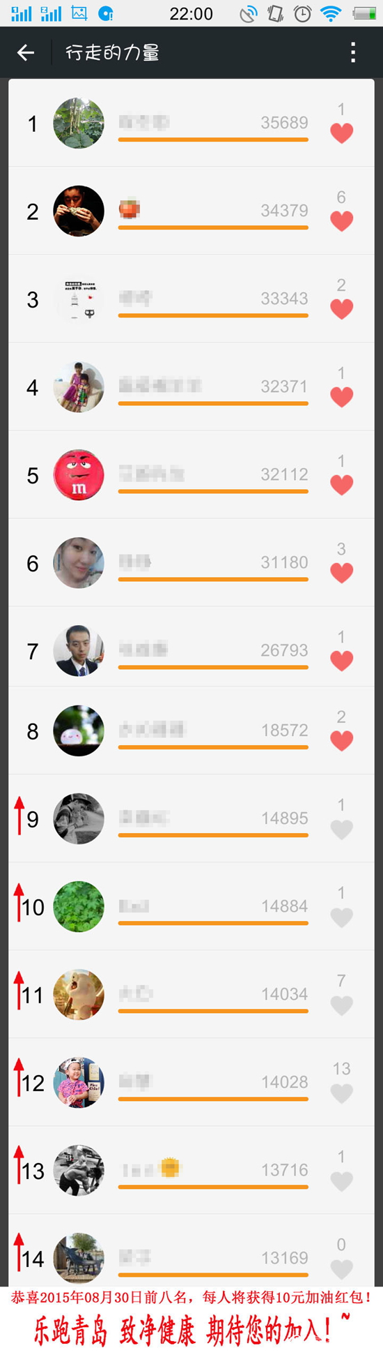????活動行至于此,已經(jīng)到了第20天,也是活動的最后一天,活動參與收獲了不少“愛跑一族”的歡迎,而每天10元的“加油紅包”也已安心送至前八強的口袋中,具體參與情況如下:
