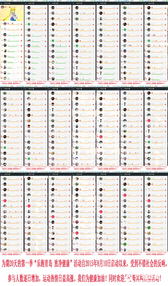 ??? 經(jīng)過20天艱苦卓絕的“微信運動線上賽”,不少“愛跑一族”全情投入,積極參與了我們的比賽,每天10元的“加油紅包”也已安心送至每天前八強的口袋中,積少成多的力量讓人們重新愛上了運動,重新開始追逐健康生活方式。