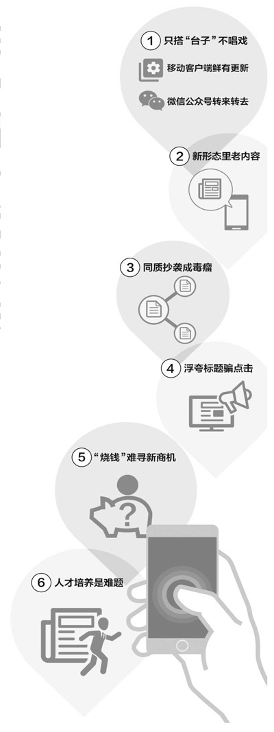 ????有了新平臺(tái),內(nèi)容卻跟不上。在媒體融合中,類似這種“新瓶裝舊酒”的做法比較普遍,很多傳統(tǒng)媒體所辦的微博、微信、客戶端,只是簡(jiǎn)單將刊發(fā)的內(nèi)容再發(fā)一遍,不考慮新傳播平臺(tái)的特殊性,也不考慮用戶的閱讀習(xí)慣。
