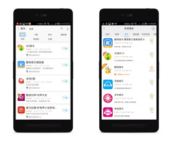 ??? 首先看應(yīng)用寶,雖然后者未給出具體排名,但從下載量上不難看出,酷狗音樂以5.4億次下載量排名首位,緊隨其后的是QQ音樂,下載量為4.4億;在星級評分上,酷狗音樂也以4星半的評分,領(lǐng)先于QQ音樂的4星。值得一提的是,出于競爭和版權(quán)原因,應(yīng)用寶并未收入其它兩款作品。