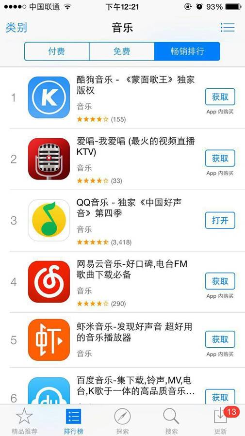 ??? 在iOS系統(tǒng)上,我們直接檢索的的是App?Store音樂App暢銷排行榜,而這一次,酷狗音樂依舊雄踞榜首之位,第二位為新晉的唱歌App愛唱,QQ音樂、網(wǎng)易云音樂以及蝦米音樂,則分別排行3、4、5位,酷我音樂在這一項(xiàng)上的表現(xiàn)不敵網(wǎng)易云音樂和蝦米音樂,排在另外一款音樂App百度音樂之后,位列總榜第7名。