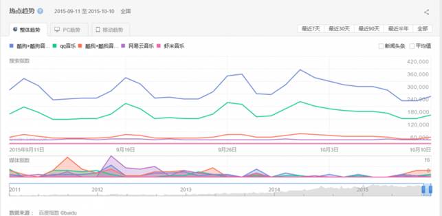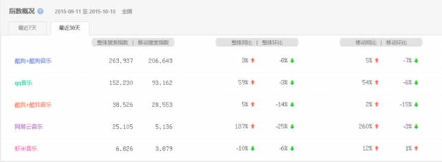 ??? 相比之下,酷我音樂則相對表現(xiàn)平平,其30天內(nèi)整體搜索指數(shù)上漲了5%,移動(dòng)搜索指數(shù)上漲了2%。而比起QQ音樂僅兩位數(shù)的增長量,網(wǎng)易云音樂雙雙破百的增長速度顯然更為顯眼,其30天內(nèi)整體搜索指數(shù)大漲了187%,移動(dòng)搜索指數(shù)更是暴漲了260%;相比之下,蝦米音樂則略顯低迷,雖然移動(dòng)搜索指數(shù)同比上漲了12%,但整體搜索指數(shù)仍下跌10%。