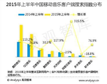 ??? 在知名數(shù)據(jù)機(jī)構(gòu)易觀智庫給出的數(shù)據(jù)中,酷狗音樂在2015年上半年位居搜索指數(shù)榜首之位,增長率高達(dá)113.2%;QQ音樂則位居其次,增長率為76.8%;酷我音樂依舊排行第三,增長率為30.3%。不過相比之下,網(wǎng)易云音樂雖然總體搜索指數(shù)較低,但增長率卻再次登頂,達(dá)到了驚人的315.5%;蝦米音樂也同樣表現(xiàn)突出,增長率微超QQ音樂,達(dá)到了76.9%。