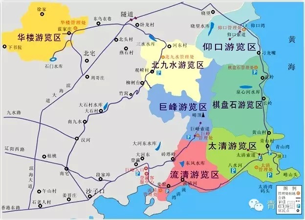 ????從柳樹(shù)臺(tái)至沙子口附近的漢河村為南九水,全程約5公里,山舒水緩,林幽壑美,公路蜿蜒,有時(shí)云隔路斷,人行于云端,俗稱(chēng)十八盤(pán)。農(nóng)舍沿澗依山勢(shì)點(diǎn)散而居,桃、櫻、修竹、山花野草爛漫于峽谷,層層梯田布其間,生機(jī)勃勃。南九水村南峽澗緊湊對(duì)峙,由此進(jìn)入景區(qū)。東有奇峰“紗帽崮”,崮下為觀川臺(tái),臺(tái)北是盤(pán)山公路及沿澗山村。南有秀峰佇立叫“將軍崮”,澗水由此滾滾出峽。彈月橋穹隆飛架于深澗之上。其北偏西向的山麓古木翳天,松出石隙,相映競(jìng)秀。倚崖面澗有明初建“龍泉觀”。再上行,巉崖峭立,林木漸密,澗底水響,林中鳥(niǎo)鳴,構(gòu)成美妙的樂(lè)章。有兩條山脈蜿蜒至此相聚,形如二龍戲珠,地名“王子澗”。其上盡是峭壁削崖,公路曲折蜿蜒,稱(chēng)“十八盤(pán)”。終端即“柳樹(shù)臺(tái)”,臺(tái)東豁一口,可登巨峰,北險(xiǎn)深壑,秀峰峽立,谷底即為北九水。