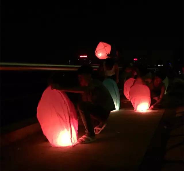 ????▲在河邊的夜空放飛一盞“孔明燈”。