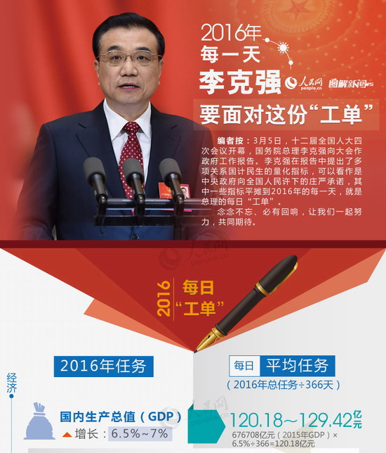 人民網北京3月5日電(記者趙艷紅 實習生顧雯)3月5日,十二屆全國人大四次會議開幕,國務院總理李克強向大會作政府工作報告。李克強在報告中提出了就業(yè)、減負、脫貧、修路等多項關系國計民生的量化指標,其中一些指標平攤到366天,就是總理2016年的每日“工單”。