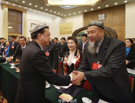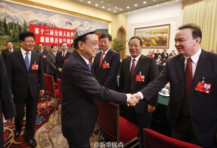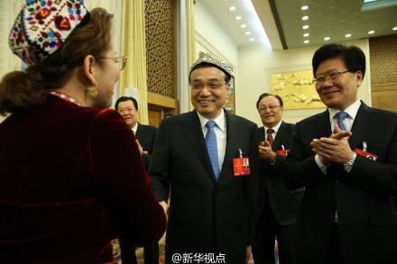 ????3月10日上午,中共中央政治局常委、國務(wù)院總理李克強(qiáng)參加十二屆全國人大四次會(huì)議新疆維吾爾自治區(qū)代表團(tuán)審議?,F(xiàn)場一位維吾爾族女代表為總理戴上一頂花帽??偫碛H切跟大家打招呼,與代表們一一握手。他說:“你們從很遠(yuǎn)的地方來,我要和每位代表握握手!”(據(jù)新華社“新華視點(diǎn)”微博報(bào)道)