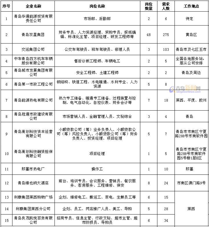 ????本次活動得到我市國有企業(yè)的積極響應(yīng)與支持,首批共有雙星集團(tuán)、交運(yùn)集團(tuán)、華通集團(tuán)、中車青島四方機(jī)車等15家大型國有企業(yè)參加,提供各類崗位招聘計劃544個,涉及工程師、項目經(jīng)理、財務(wù)專員、市場營銷、酒店管理、商超導(dǎo)購、公交駕駛員等90余個職位,主要面向我市家庭貧困人員、下崗再就業(yè)人員和貧困家庭應(yīng)屆高校畢業(yè)生群體,企業(yè)將在同等條件下對上述人員優(yōu)先聘用。