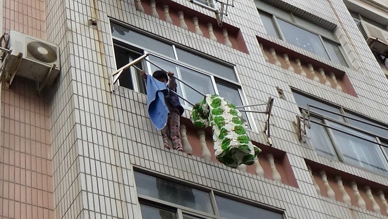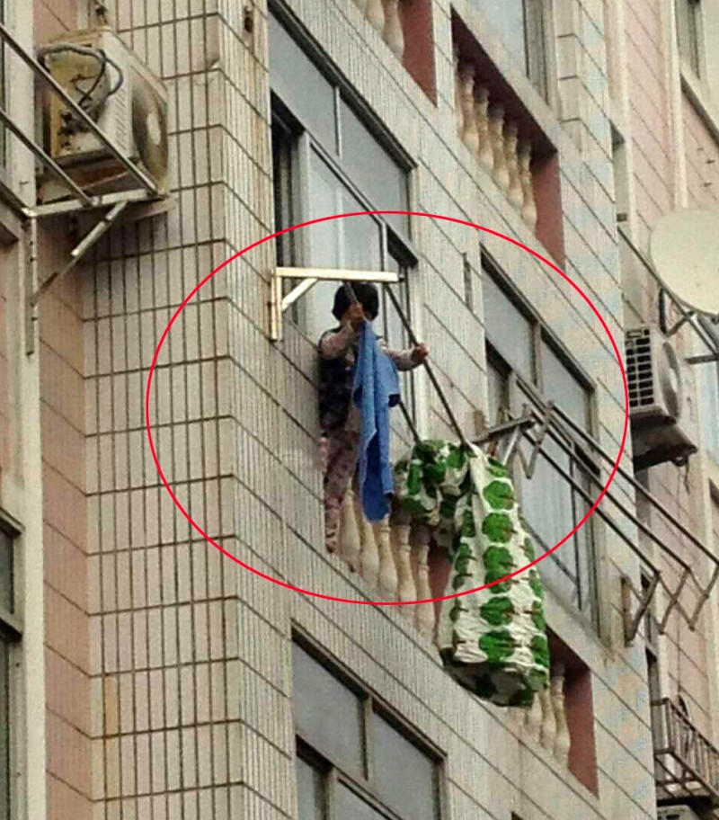 玲玲懸在三樓的晾衣架上(近景)。趙玉勛攝