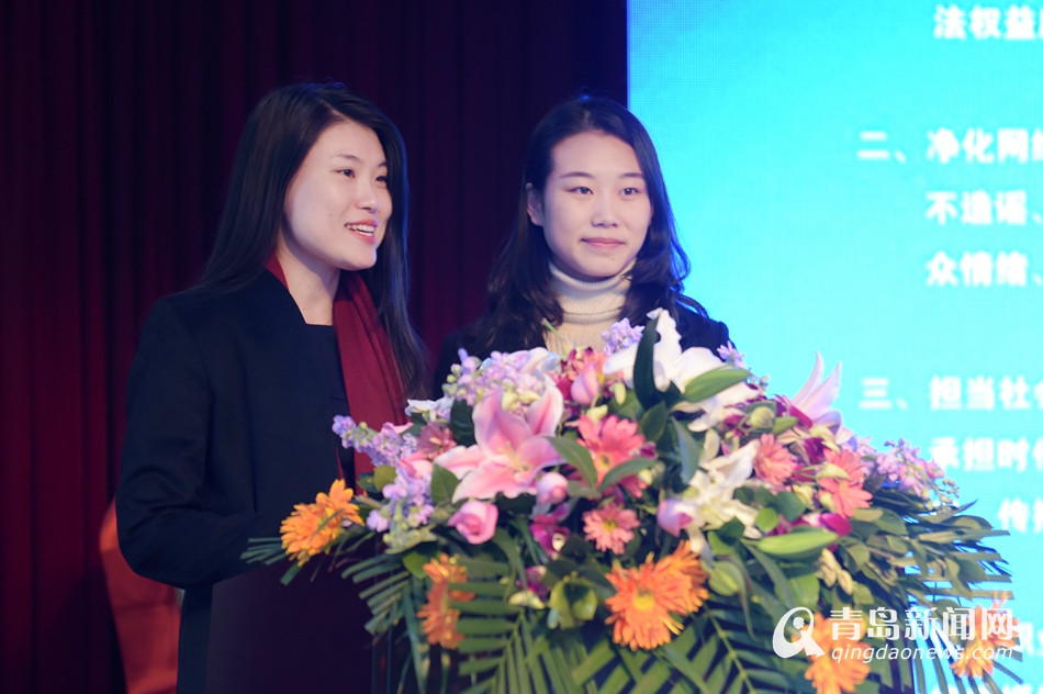 青島優(yōu)生活總經(jīng)理陳曉燕(左)、山東聯(lián)創(chuàng)社董事長鐘小桐(右)宣讀《青島市自媒體聯(lián)盟自律公約》