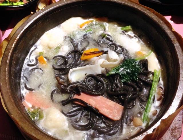 ????面真心不錯啊,湯頭濃郁鮮美,據(jù)說是用鱈魚骨熬的,墨魚面是黑色的,吃起來很筋道~容器是石鍋的,很燙,服務(wù)員會叮囑不要亂碰。里面內(nèi)容真的很豐富!