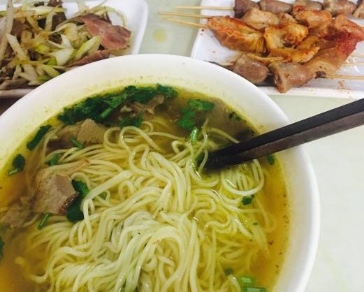 ????紅燒肥腸面,肥腸處理的干凈,面的口感勁道,湯頭酸辣適中,配菜新鮮,再來幾串烤肉,肉串的腌制剛好,味道配面更搭配。