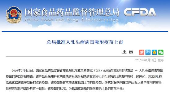 2016年7月,國家藥監(jiān)局批準(zhǔn)了人乳頭瘤病毒吸附疫苗(HPV疫苗,又稱子宮頸癌疫苗)的進(jìn)口注冊申請。