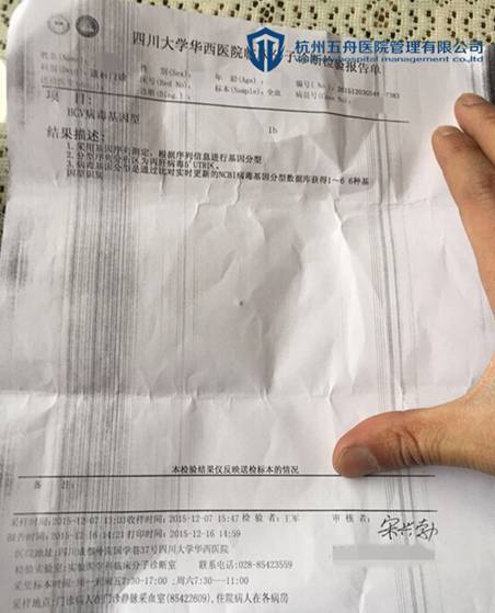 ??? 當(dāng)天下午2點(diǎn)左右,陳先生把檢查報(bào)告發(fā)到杭州五舟郵箱,杭州五舟工作人員把電子版合同發(fā)給陳先生查看。下午5點(diǎn)30分陳先生再次致電杭州五舟,表示合同沒有問題。杭州五舟蔣醫(yī)生也看過了陳先生的檢查報(bào)告,告知陳先生他的情況適用印度的索非布韋和達(dá)卡他韋,且只要一個(gè)療程就可以了。陳先生希望能當(dāng)面簽合同,于是和蔣醫(yī)生約定1月3日早上11點(diǎn)到杭州五舟公司簽定合同。