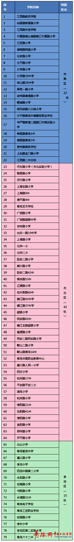 江西路、寧夏路、高田路、燕兒島路、逍遙三路、銀川西路、安慶路、江蘇路、湖南路、德縣路、太平路、文登路、萊蕪一路、齊東路、延安三路、芝泉路、華嚴(yán)路、香港西路、東海西路、佛濤路、東海一路、仰口路、徐州路香港路小學(xué)門前區(qū)域、貴州路汶上路路口、云南路廣州路路口、四川路團(tuán)島早市、廣州路云南路口、太平路單縣支路口。