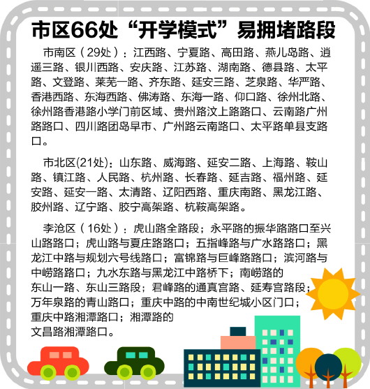????2月13日島城中小學(xué)開(kāi)學(xué),青島交通又將進(jìn)入“開(kāi)學(xué)模式”,開(kāi)學(xué)后,早高峰期間,東向西的車(chē)流量將變大;晚高峰期間,西向東的車(chē)流量將大增。預(yù)計(jì)從早上6點(diǎn)40分將出現(xiàn)交通早高峰,一直會(huì)持續(xù)到8點(diǎn)半甚至9點(diǎn);晚高峰將從下午4點(diǎn)持續(xù)到晚上6點(diǎn)半甚至7點(diǎn)。