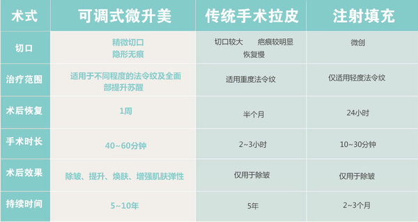 可調(diào)式微升美所凸顯的三大特色,將成為中國整形美容界年輕化的新亮點(diǎn),包含面部除皺、面部提升、煥膚修復(fù)。讓我們用一張表格來看清可調(diào)式微升美與其它美容方式的區(qū)別。
