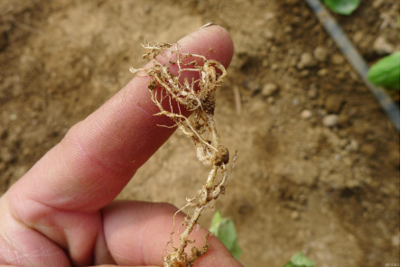 由于根系受到損害,根系活力下降,對營養(yǎng)和水分的吸收、輸送變差,根部生長受阻而常出現(xiàn)不長新根的現(xiàn)象。另外在根結(jié)線蟲危害嚴重時,根腐病、枯萎病等病菌與線蟲共同危害,造成爛根、根腐,進而影響病株的生長。一般來說,病株在受害初期癥狀不明顯,長不快、矮小、果實小且少,與缺水缺肥癥狀相似。在受害中后期,植株早衰退化、萎蔫,甚至是枯萎而死。