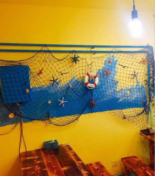 話說(shuō)店里的環(huán)境好得絕對(duì)不像是一家炸串店,外面有室外座,屋里的裝飾充滿了海洋風(fēng),完全沒(méi)有那種炸串店的油膩感,有種小酒吧的感覺(jué)。