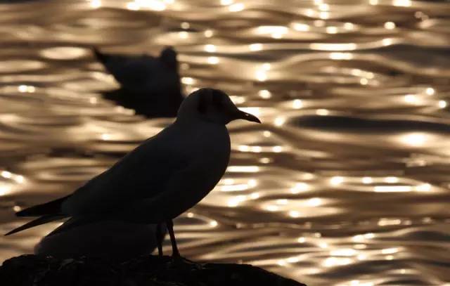 ????當太陽偏西沉下,出現(xiàn)在鏡頭里的海鷗美成了一個剪影,輪廓那么流暢生動,像剪紙藝術(shù)家的作品。
