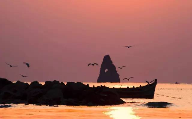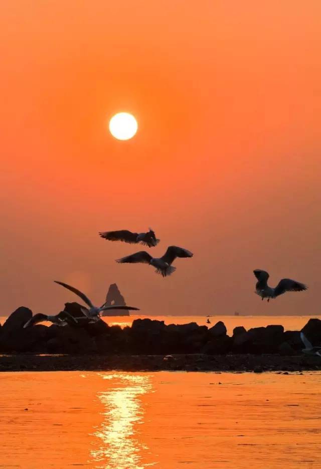 ????景色依據(jù)時令、時辰而變。夜色漸濃的石老人海灘,披上金紗衣,遠處的海鷗被映照成剪影,別具一格,撩人眼球。