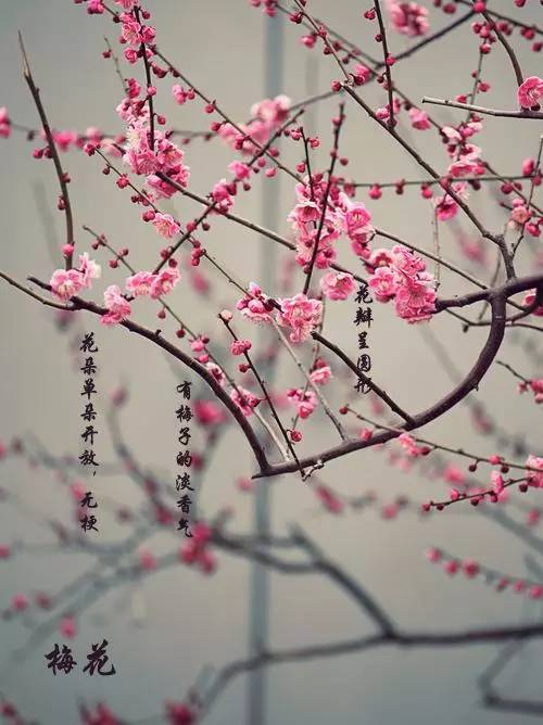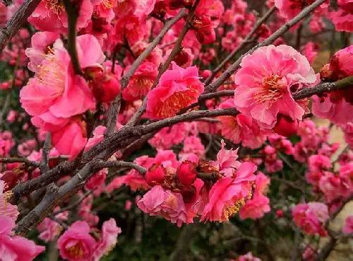花期最早,多在1-3月間,花落后再長葉。(青島梅花花期多在3-4月,一般3月初嶄露頭角,中下旬盛開。)