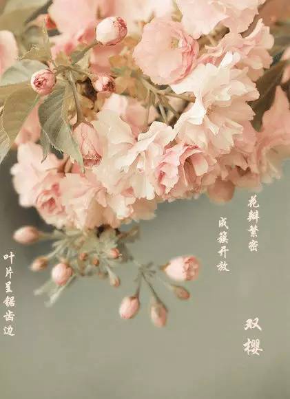 雙櫻成簇開放,花瓣繁密。